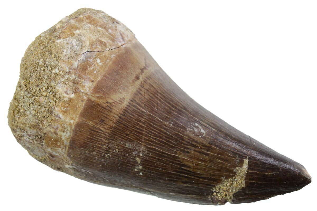 This is a 2.05" fossil mosasaur (Thalassotitan atrox) tooth from the Upper Cretaceous phosphate deposits in the Oulad Abdoun Basin of Morocco.