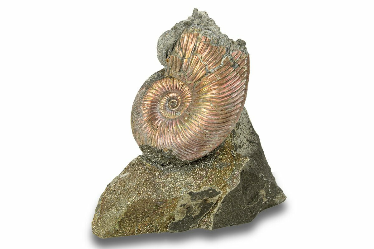 This is an interesting and colorful pyritized ammonite (Quenstedticeras sp.) display. The ammonite was collected from the Middle Jurassic age deposits along the banks of the Volga River near Saratov, Russia. It has been mounted to this section of iridescent pyrite ("rainbow pyrite") encrusted rock to create this alluring display.