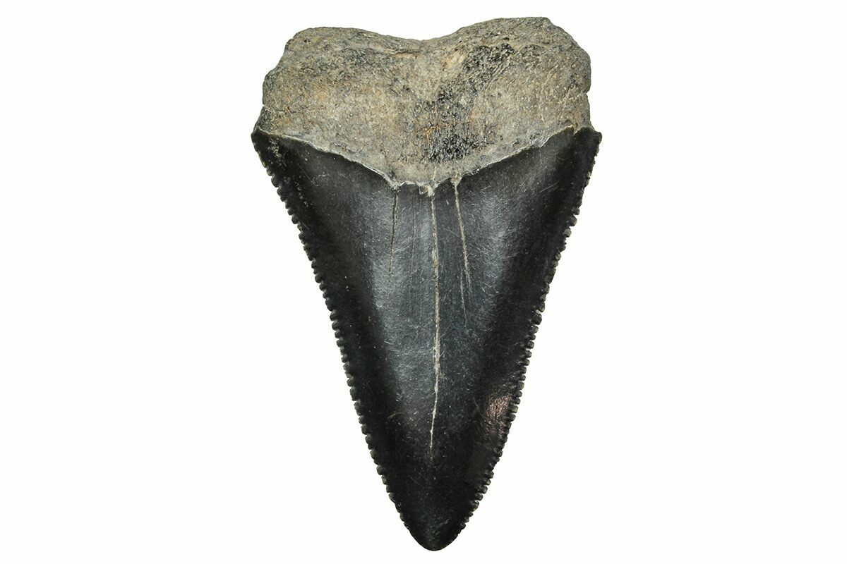 This is a serrated, 2.06" long fossil great white shark (Carcharodon carcharias) tooth from North Carolina. It was collected from a stream lag deposit near Greeenville and it came out of the Upper Yorktown Formation.