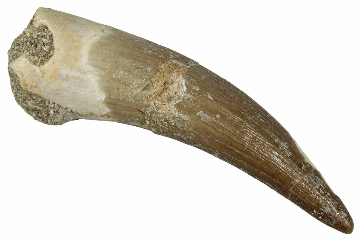This is a 2.07" tooth from the Cretaceous marine reptile Zarafasaura oceanis, a long-necked plesiosaur known from the phosphate-rich Oulad Abdoun Basin of Morocco. The enamel displays nice preservation and natural coloration.