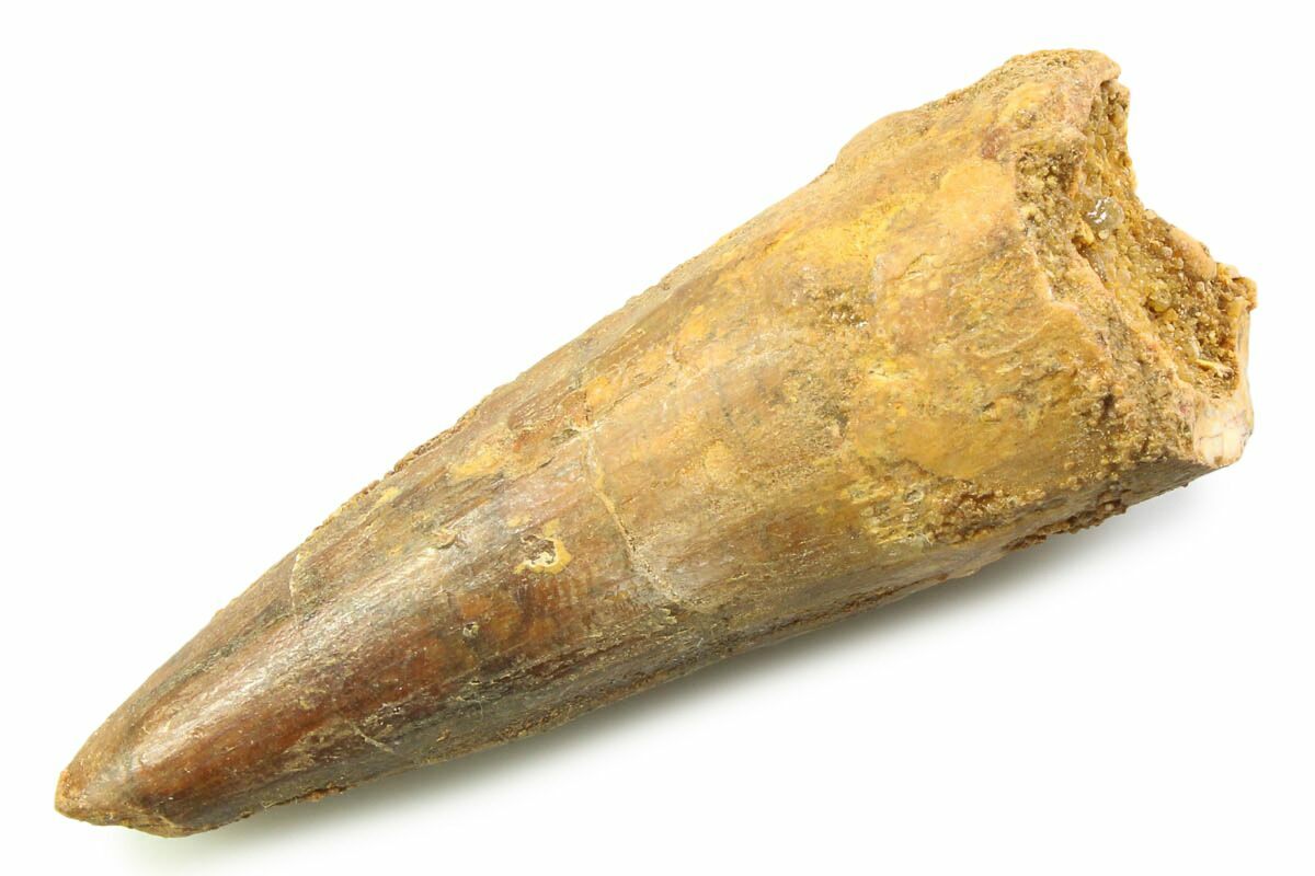 This is a 2.08" long Spinosaurus tooth from the Kem Kem Beds of Morocco. It is Late Cretaceous in age, approximately 95 million years old.