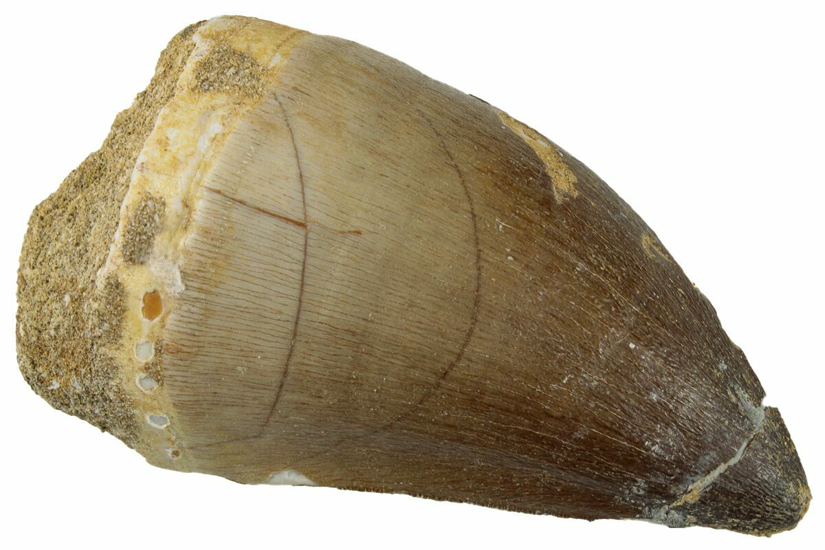 This is a 2.08" fossil mosasaur (Prognathodon sp.) tooth from the Upper Cretaceous phosphate deposits in the Oulad Abdoun Basin of Morocco. There is a repaired crack near its tip.