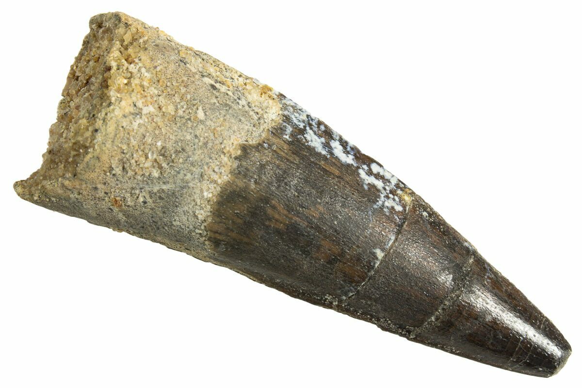 This is a 2.09" long Spinosaurus tooth from the Kem Kem Beds of Morocco. It is Late Cretaceous in age, approximately 95 million years old.