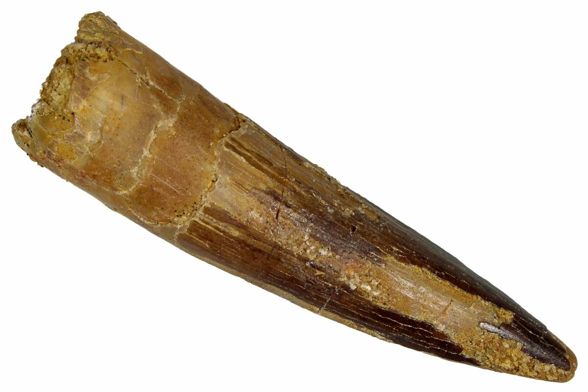 Spinosaurus teeth are relatively common fossils, but large (3+ inches), well-preserved examples are rare. These large Spinosaurus teeth will often be heavily doctored. We’ve seen many examples where multiple partial teeth can been glued to together to create a larger fake tooth, or where enamel has been painted on. One giveaway to look for is a ring of sand around the middle of the tooth, usually glued on to hide a break. Sometimes this is a sign that multiple partial teeth have been composited, but other times it is used to disguise a badly done repair job.