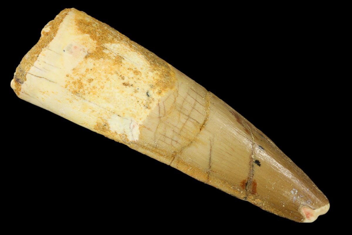 Spinosaurus teeth are relatively common fossils, but large (3+ inches), well-preserved examples are rare. These large Spinosaurus teeth will often be heavily doctored. We’ve seen many examples where multiple partial teeth can been glued to together to create a larger fake tooth, or where enamel has been painted on. One giveaway to look for is a ring of sand around the middle of the tooth, usually glued on to hide a break. Sometimes this is a sign that multiple partial teeth have been composited, but other times it is used to disguise a badly done repair job.