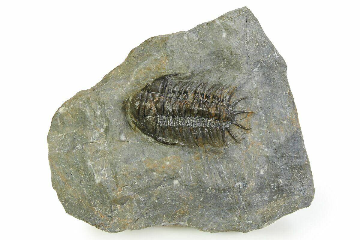 This is an uncommon, 2.1" long Crotalocephalus trilobite from the Bou Tchrafine Formation of Morocco. This species is much rarer than the typical Crotalocephalina trilobites that you see from Morocco. This specimen is laid out prone with nice preparation and no restoration.