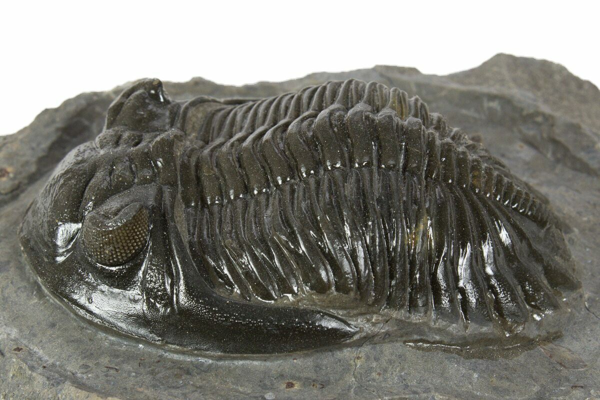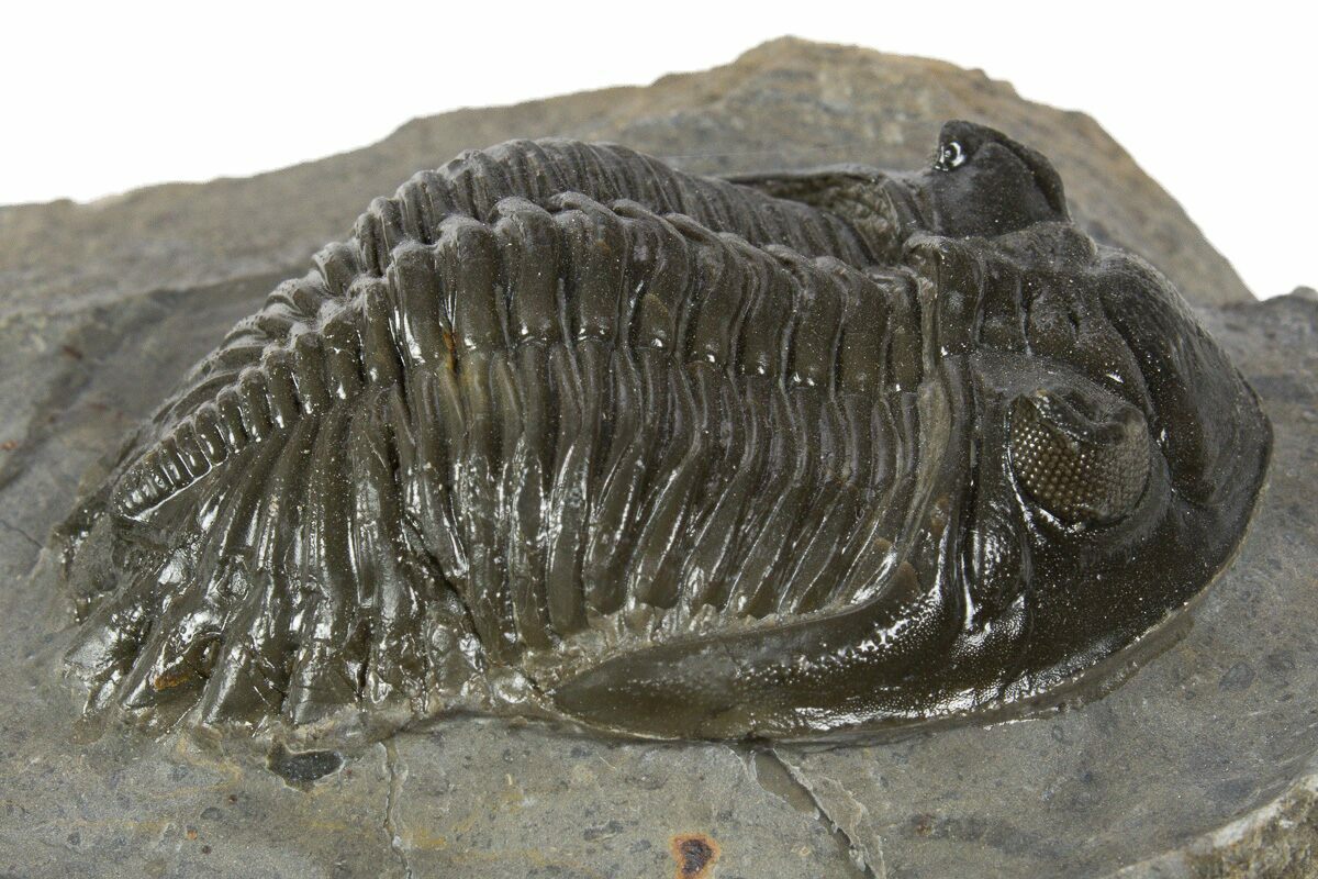 This is a beautiful, 2.1" long, Hollardops trilobite from the Ofaten region of Morocco. It features crisp eye facet preservation in both compound eyes and only about 2% shell restoration in total along repaired cracks.
