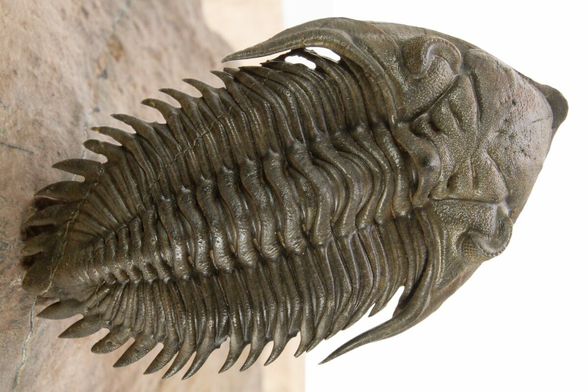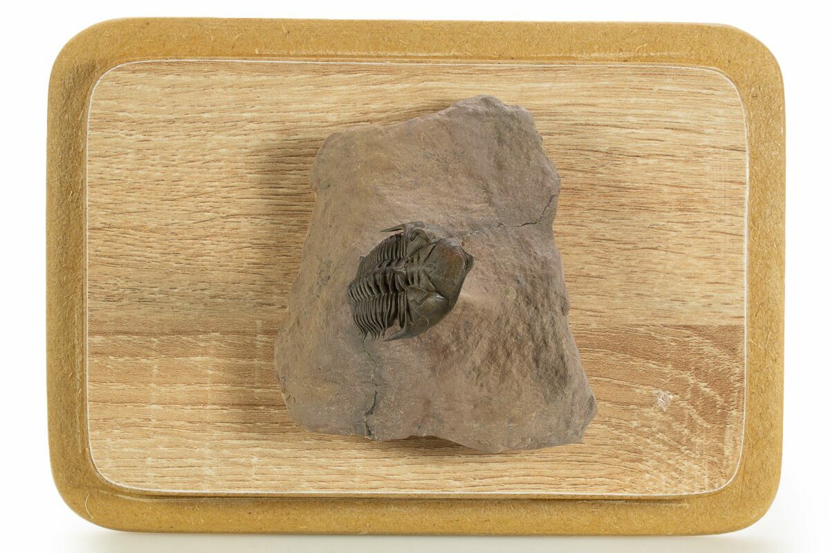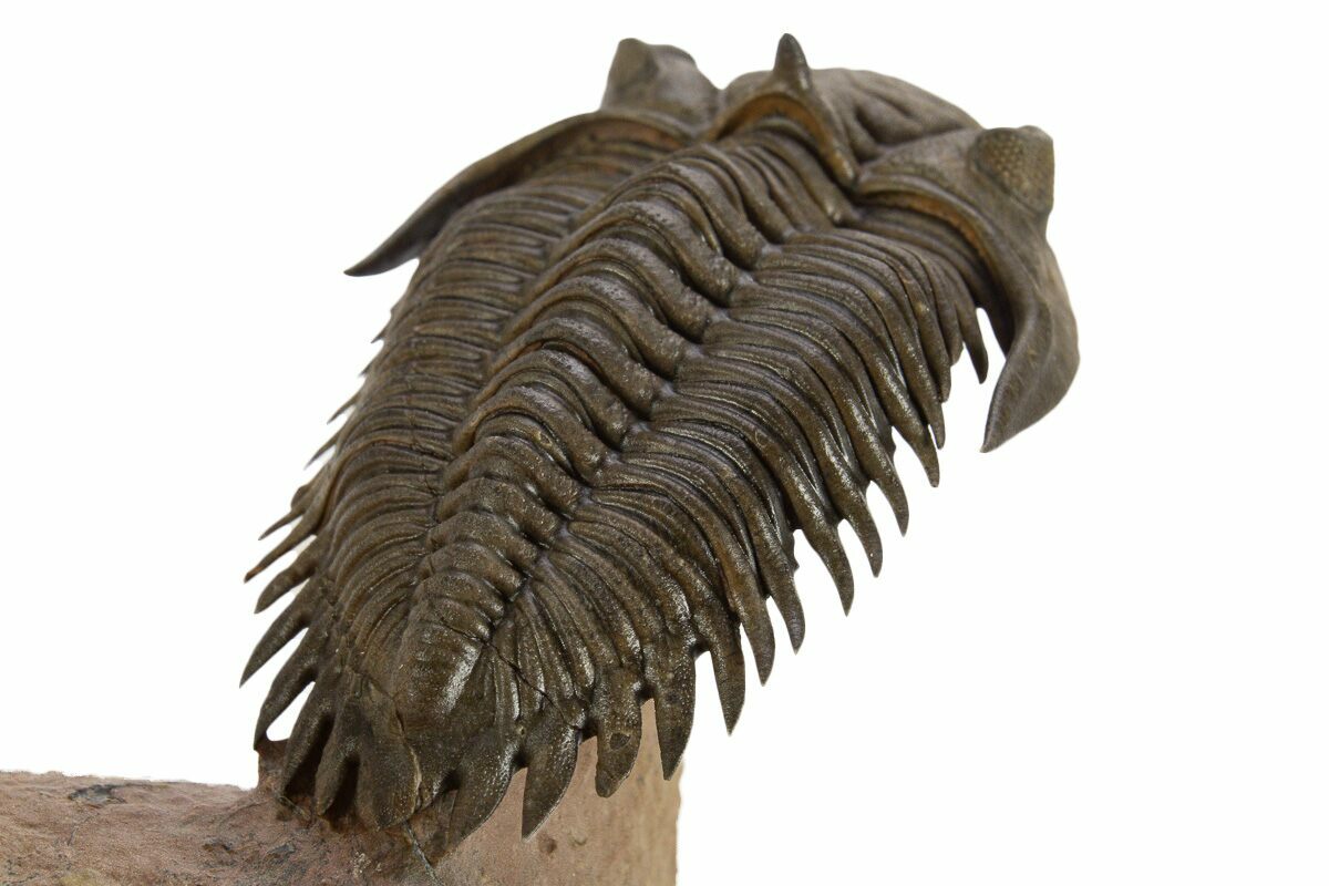 This is a beautiful, 2.1" long specimen of Metacanthina issoumourensis often referred to as an "Asteropyge" or “Kayserops”. It was quarried near Lghaft, Morocco, and has nice eye facet preservation in both eyes. Nearly all of the rock has been removed from around it, leaving it flying on a pedestal of stone. A really aesthetic preparation.