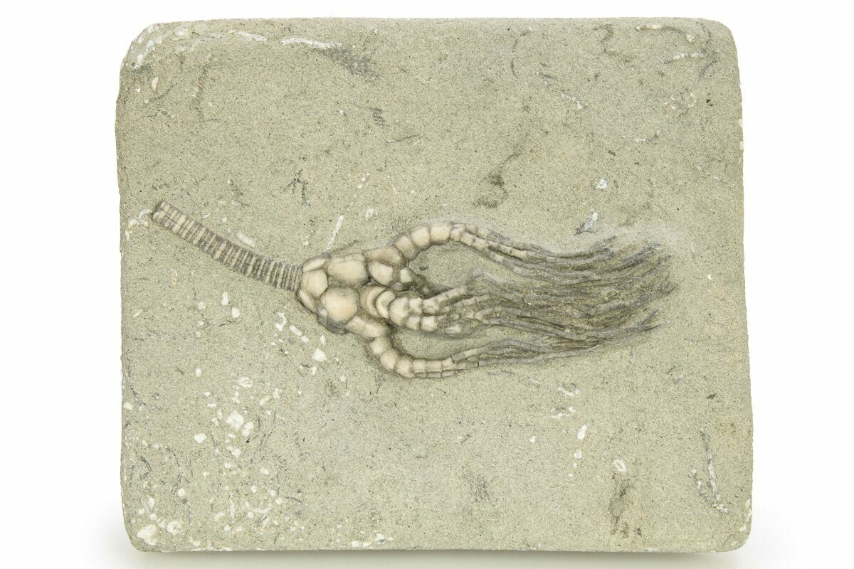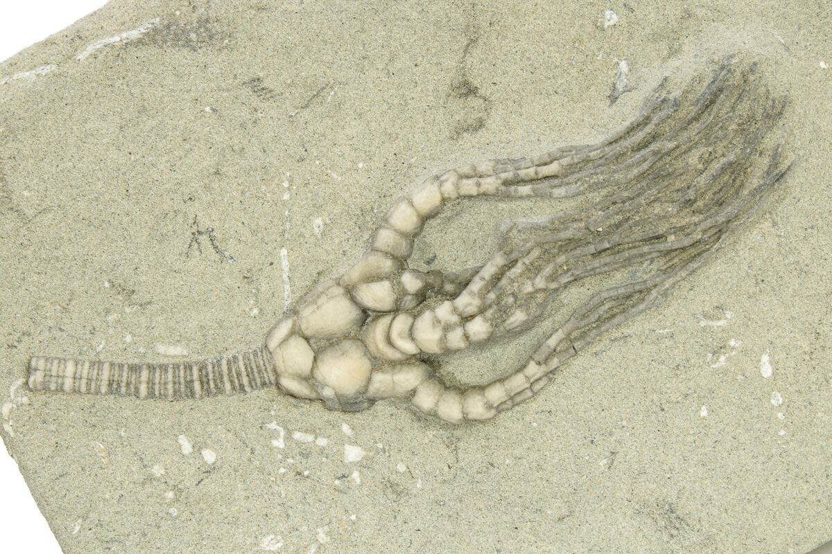 Crinoids from the Ramp Creek Limestone were likely buried in sediment from nearby deltas during storms. The resulting siltstone deposits are soft enough that fossils can be extracted in exquisite, three-dimensional relief.