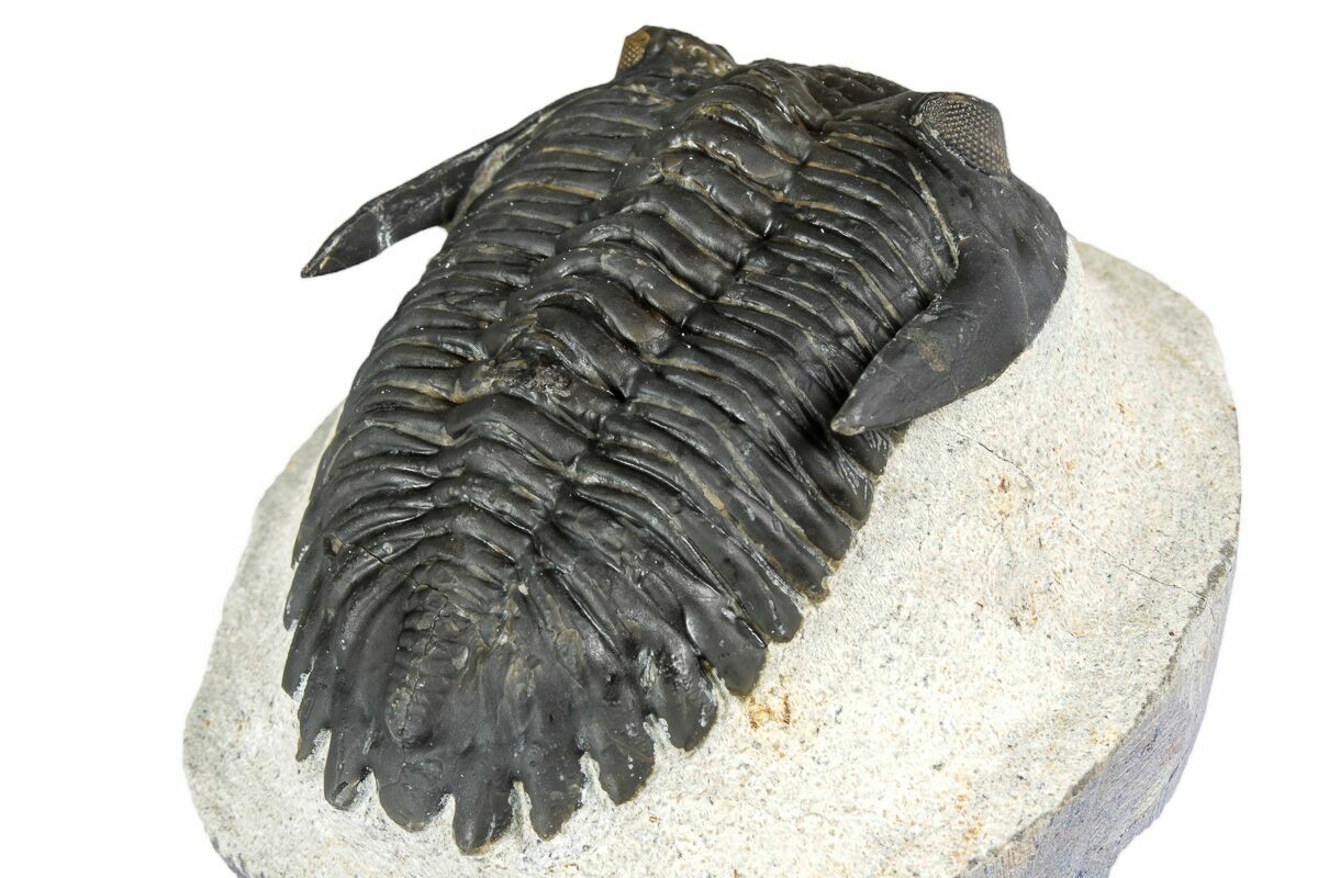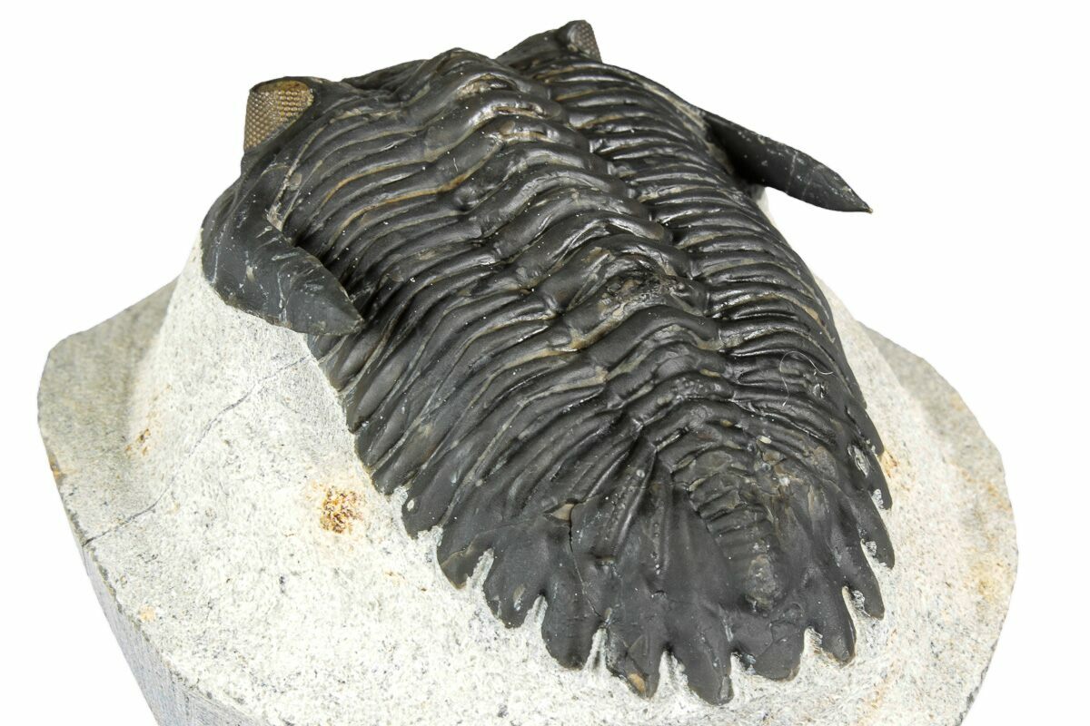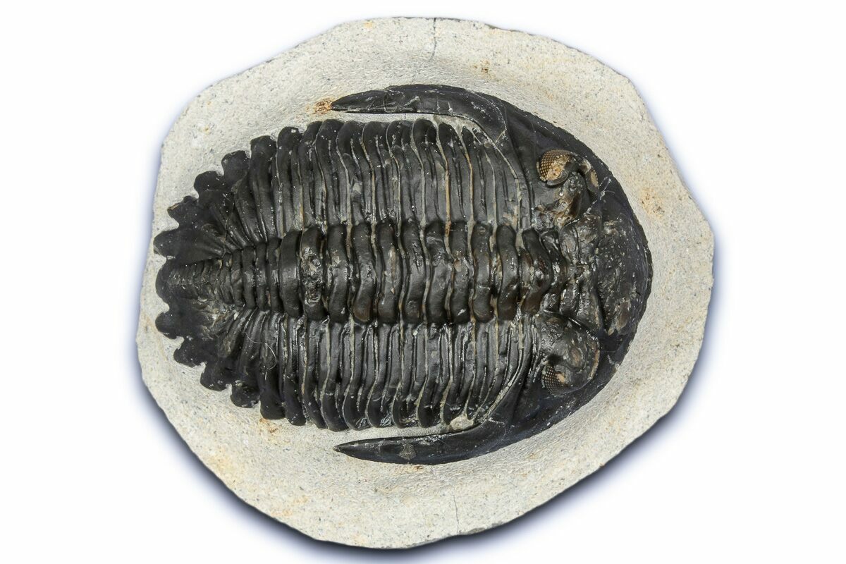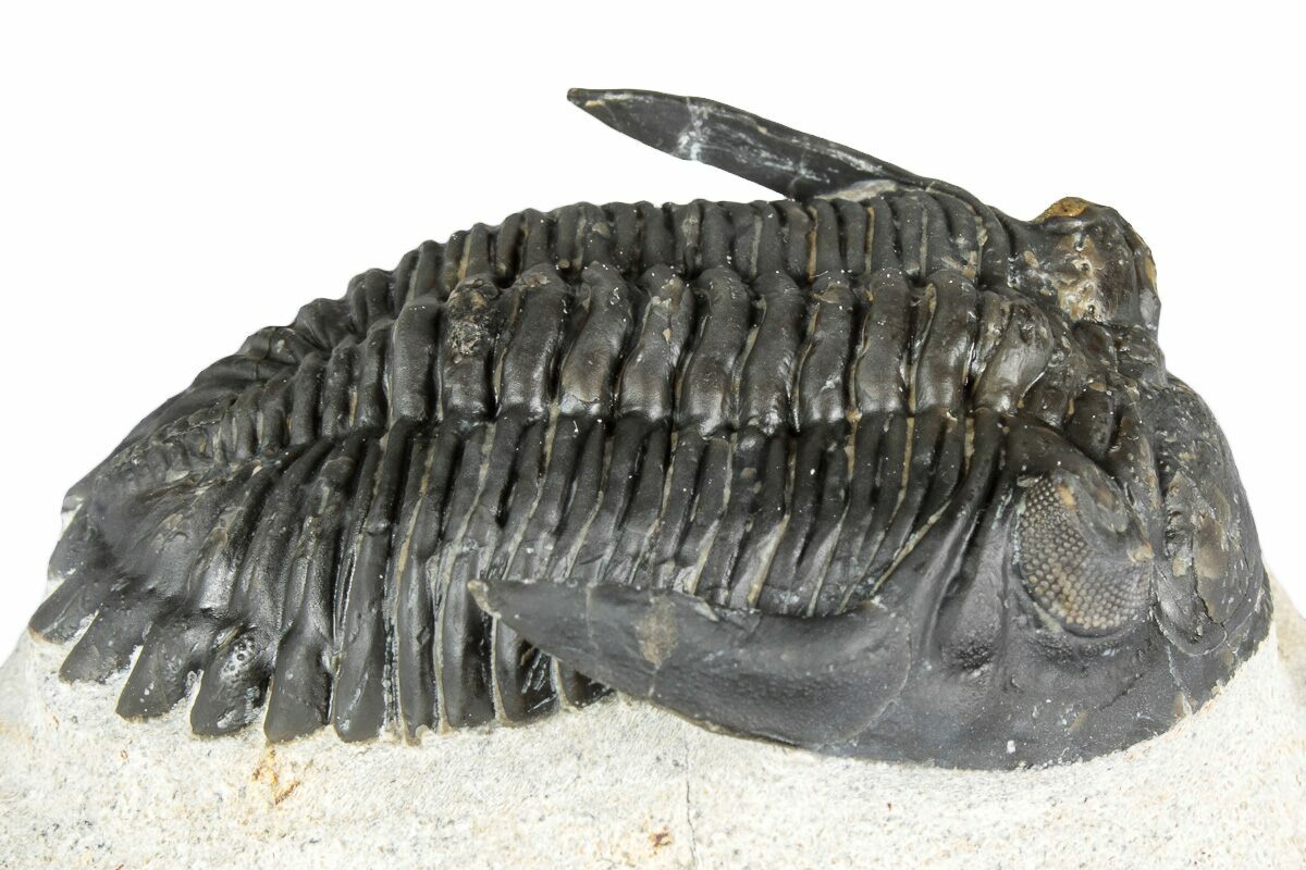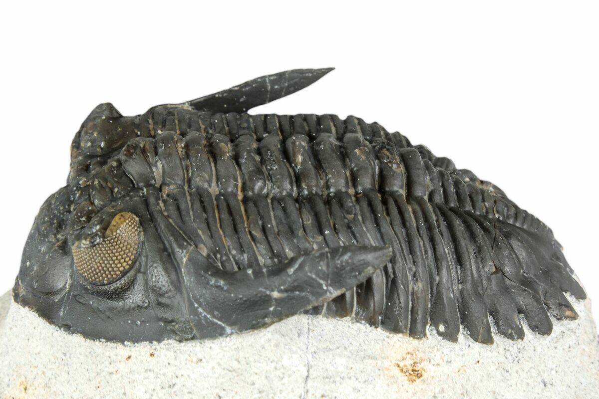This is a detailed 2.1" long, Hollardops trilobite from the Ofaten region of Morocco. It features visible eye facet preservation in both compound eyes. It has a less than 1% shell restoration, a small patch on the right genal spine.