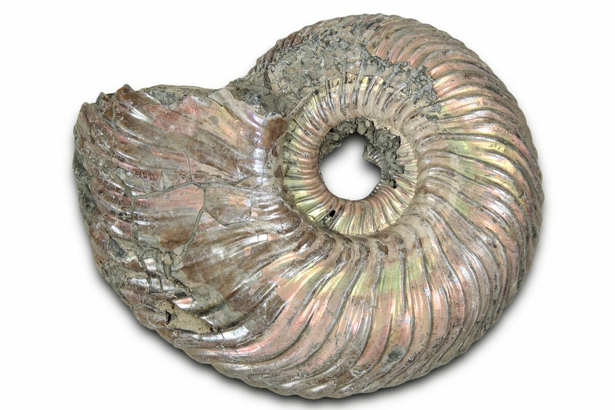 This is a gorgeous pyritized ammonite of the genus Quenstedticeras. It was collected from a Middle Jurassic age deposit along the banks of the Volga River near Saratov, Russia. You can feel the heft of the iron pyrite in the specimen when you hold it in your hand. When rotating the fossil under a light source, the shell exhibits a brilliant iridescence.