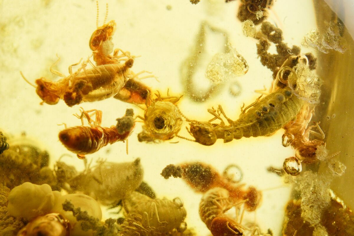 Amber is fossilized tree resin that frequently contains inclusions such as plant matter, fungi, and insects. Copal is a younger resin that has not fully fossilized, but may still be tens of thousands to several million years old. This copal is often marketed as "young amber", which many consider a misnomer, but the exact line between copal and amber is a little bit blurry. This is especially true with modern treatment techniques that can artificially age copal into amber.