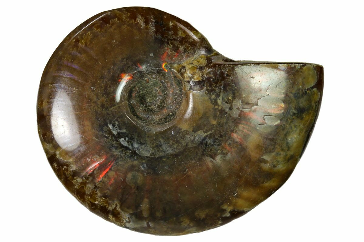 Photos don't do justice to this 110 million year old, polished ammonite fossil. It shines with brilliant iridescent red hues when the light hits it from certain angles.
