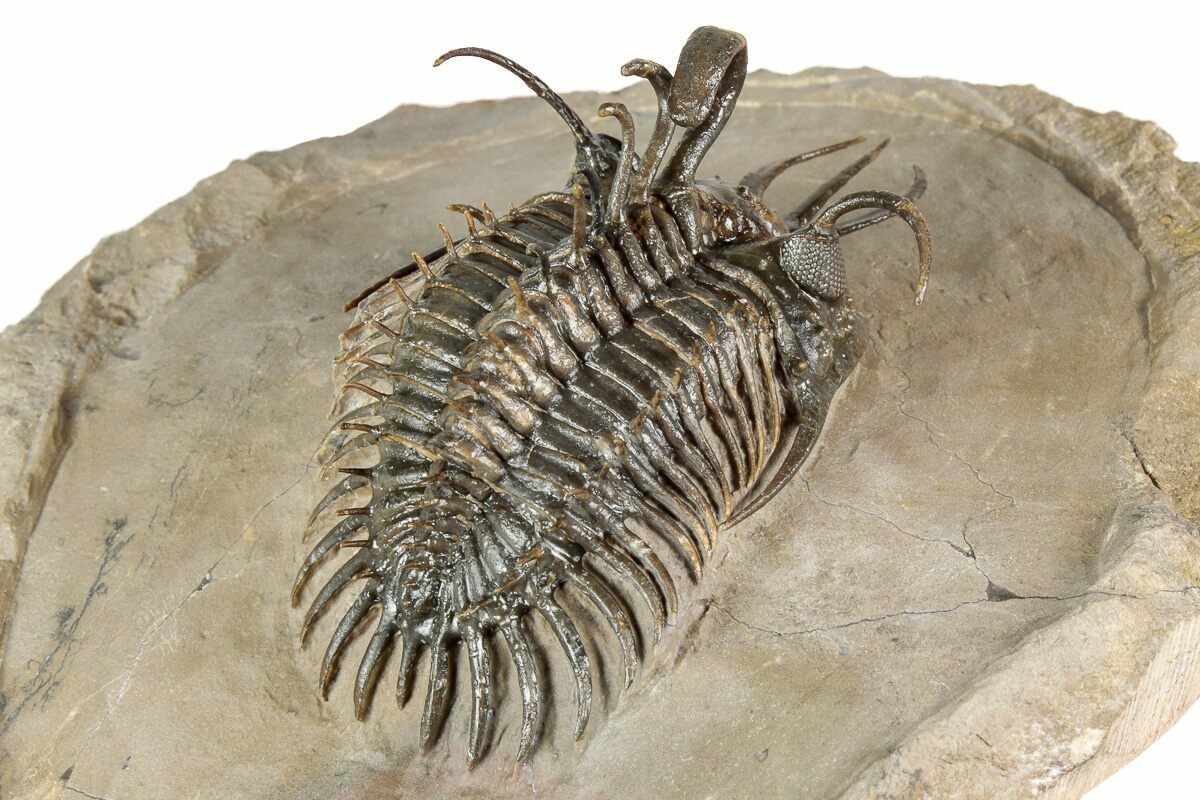 Due to the complexity of their anatomy and the challenges of preparing specimens from hard limestone matrix, well-preserved Walliserops fossils require meticulous preparation, and many of the finest examples are partially or fully freed from the rock to showcase their dramatic three-dimensional form.