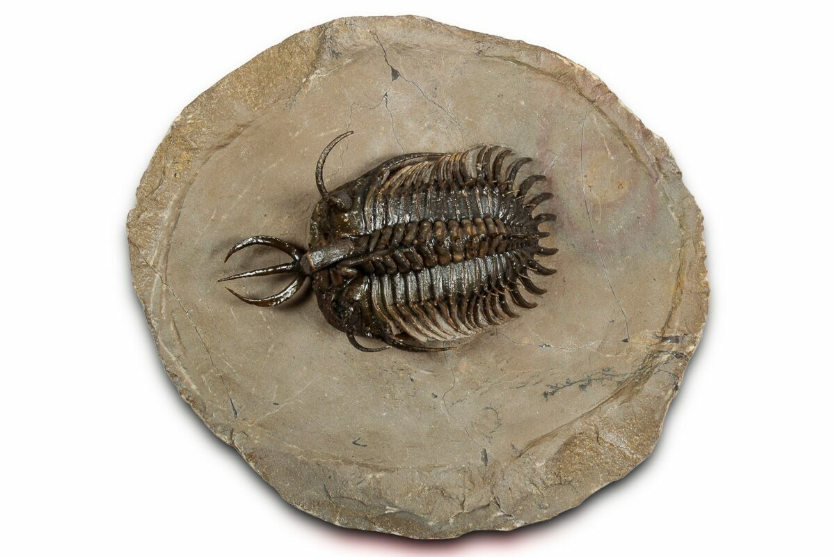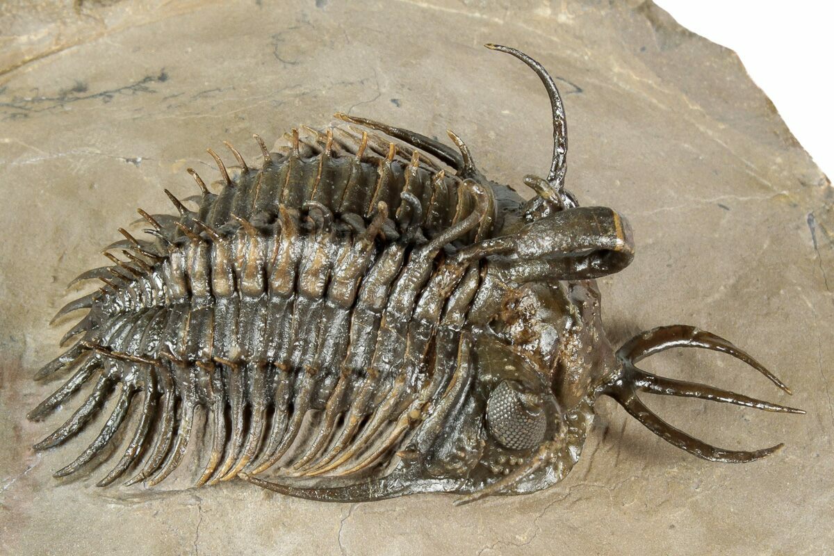 This is a beautiful 2.1" long specimen of the spiny trilobite Walliserops hammi, often called the “short-trident” Walliserops. This species is notably smaller—and considerably rarer—than the long-forked Walliserops trifurcatus found in the same deposits. With more than 40 free-standing spines along its dorsal surface, each specimen requires extensive, highly skilled preparation work.