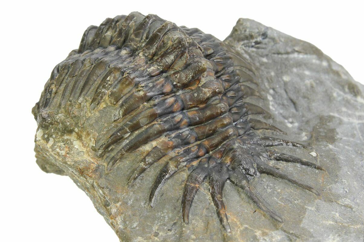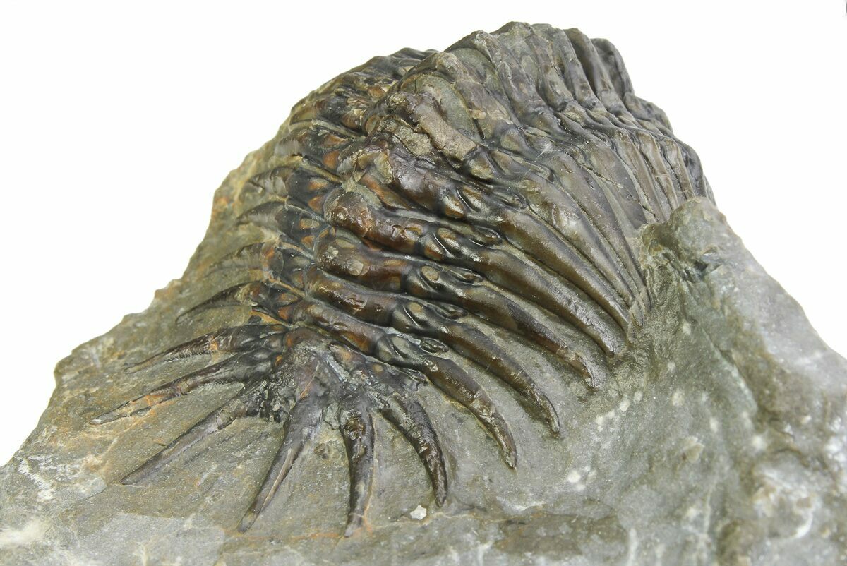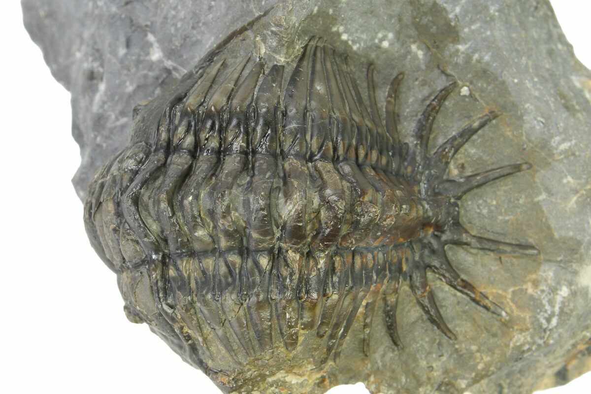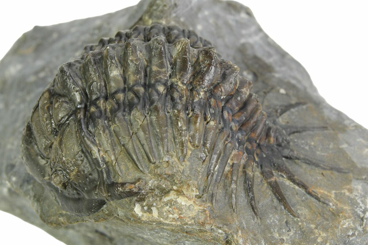 This is an uncommon, 2.1" long Crotalocephalus trilobite from the Bou Tchrafine Formation of Morocco. This species is much rarer than the typical Crotalocephalina trilobites that you see from Morocco. This specimen has less than 1% restoration in total.