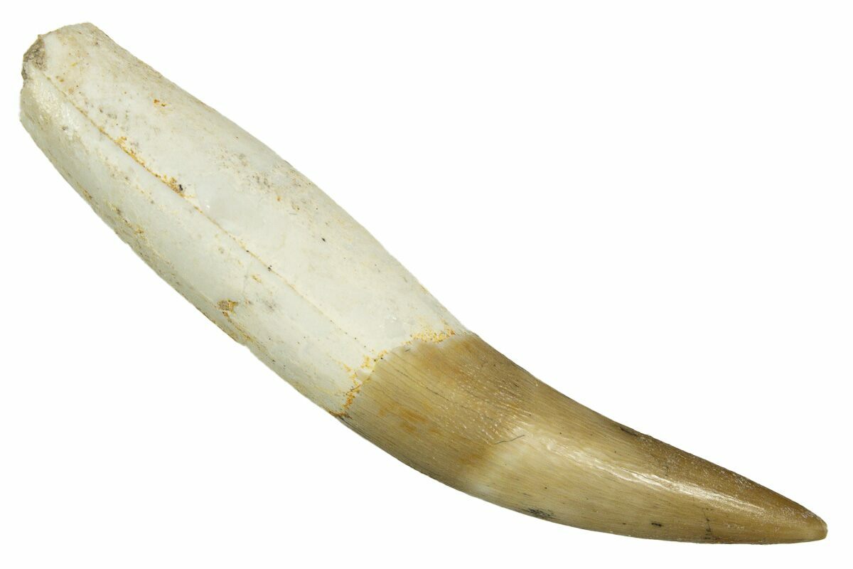 This is a 2.10" long, rooted tooth from the Cretaceous marine reptile Zarafasaura oceanis, a long-necked plesiosaur from the Oulad Abdoun Basin of Morocco. The tooth preserves nearly the entire root—a rare occurrence that indicates it was not a naturally shed tooth but one lost during the animal’s life. It has excellent enamel and an unworn tip. There are several repaired cracks along its length.