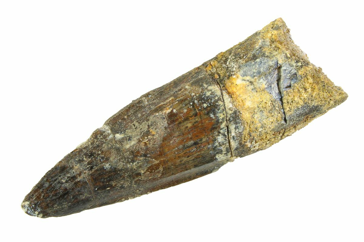 This is a 2.100" long Spinosaurus tooth from the Kem Kem Beds of Morocco. It is Late Cretaceous in age, approximately 95 million years old.