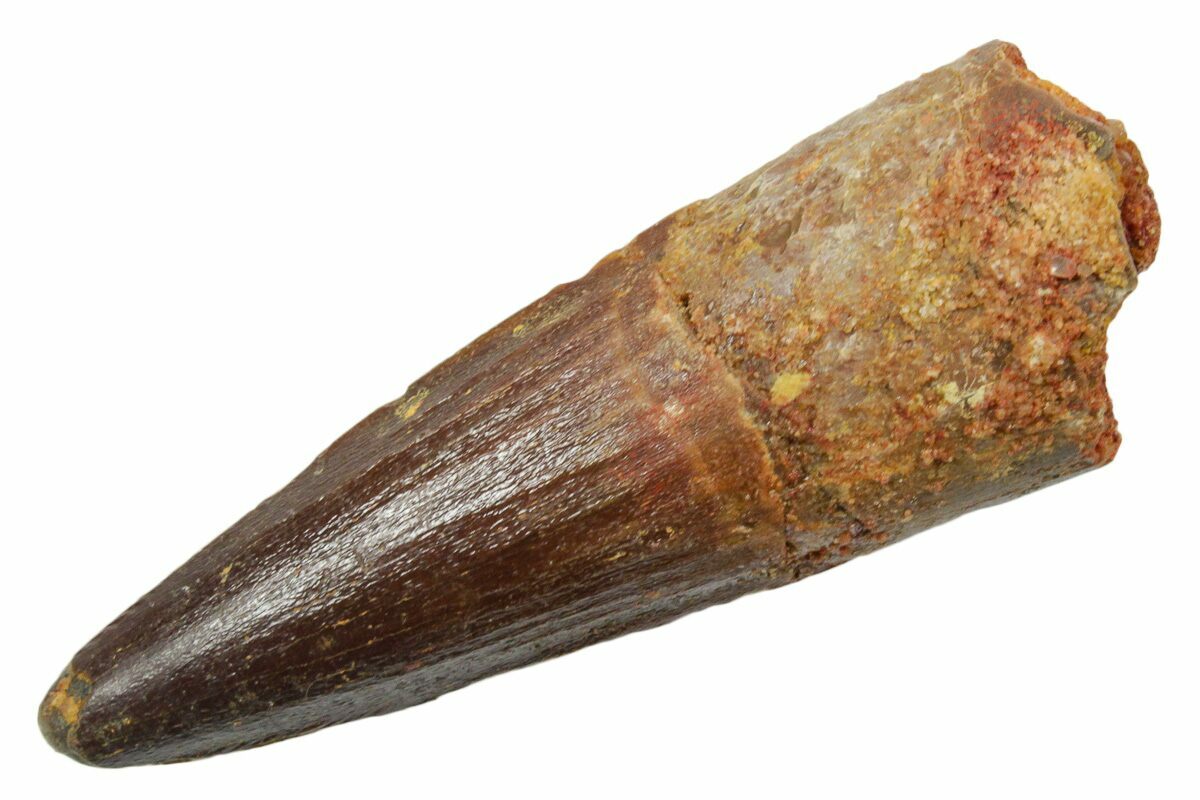 Spinosaurus teeth are relatively common fossils, but large (3+ inches), well-preserved examples are rare. These large Spinosaurus teeth will often be heavily doctored. We’ve seen many examples where multiple partial teeth can been glued to together to create a larger fake tooth, or where enamel has been painted on. One giveaway to look for is a ring of sand around the middle of the tooth, usually glued on to hide a break. Sometimes this is a sign that multiple partial teeth have been composited, but other times it is used to disguise a badly done repair job.