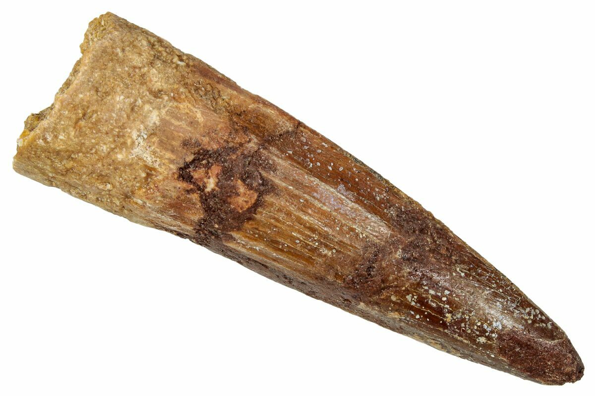 This is a 2.10" long Spinosaurus tooth from the Kem Kem Beds of Morocco. It is Late Cretaceous in age, approximately 95 million years old.