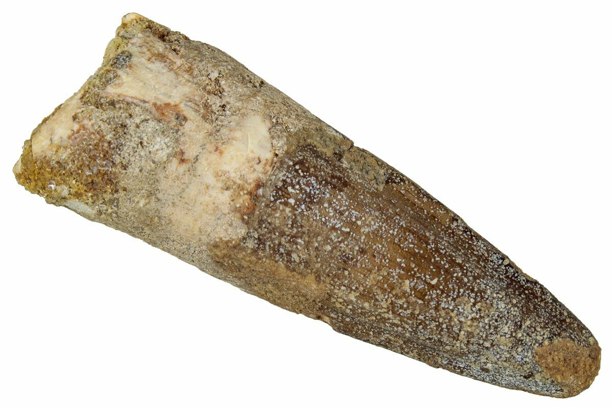 This is a 2.10" long Spinosaurus tooth from the Kem Kem Beds of Morocco. It is Late Cretaceous in age, approximately 95 million years old.