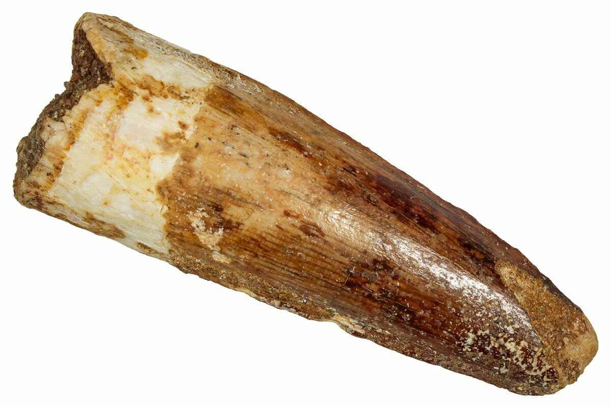 This is a 2.10" long Spinosaurus tooth from the Kem Kem Beds of Morocco. It is Late Cretaceous in age, approximately 95 million years old.