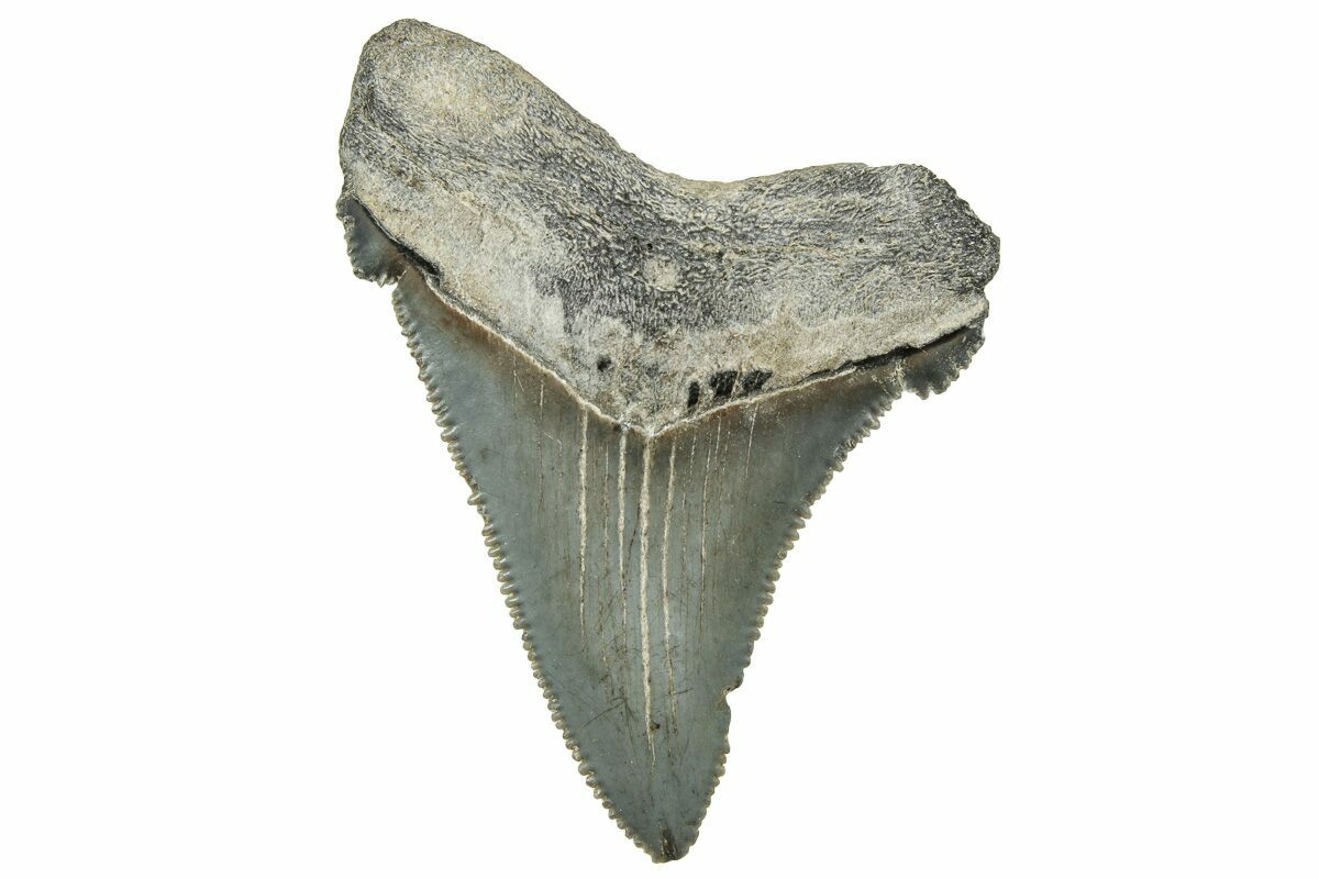 This is a serrated, 2.10" long fossil Otodus angustidens shark tooth. Angustidens is believed to be an ancestor of the fearsome megalodon shark, though it did not grow nearly as large.