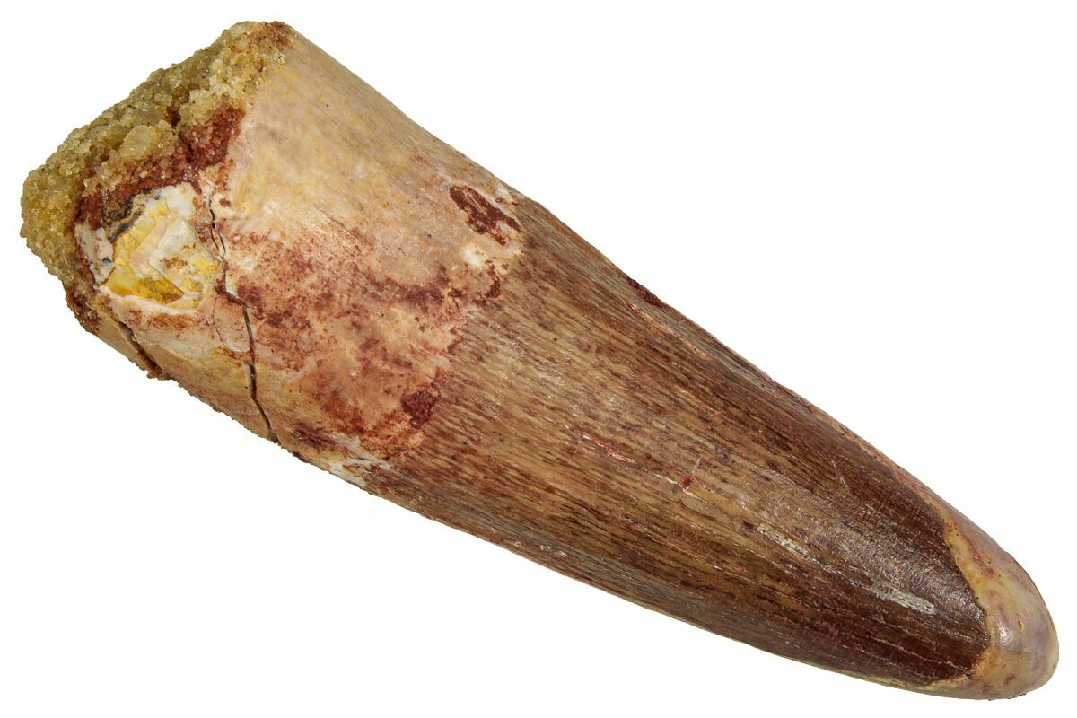 This is a 2.12" long Spinosaurus tooth from the Kem Kem Beds of Morocco. It is Late Cretaceous in age, approximately 95 million years old.