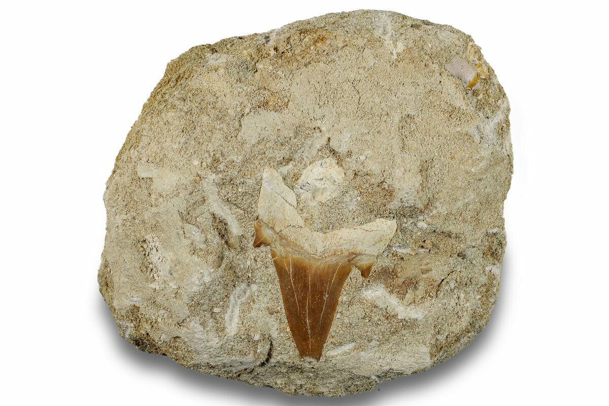 This is a 2.12" fossil tooth of the extinct giant mackerel shark, Otodus obliquus, from the phosphate deposits in the Oulad Abdoun Basin of Morocco. It is Eocene in age, or approximately 54 million years old. The tooth is only partially exposed from the rock in which it was found.