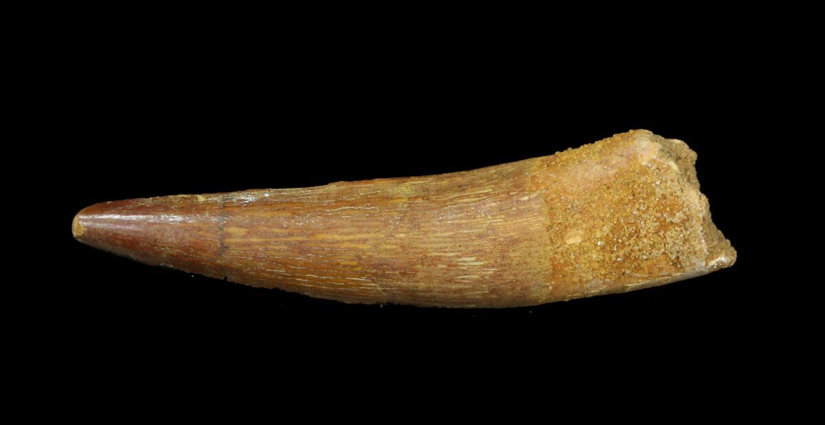 Spinosaurus teeth are relatively common fossils, but large (3+ inches), well-preserved examples are rare. These large Spinosaurus teeth will often be heavily doctored. We’ve seen many examples where multiple partial teeth can been glued to together to create a larger fake tooth, or where enamel has been painted on. One giveaway to look for is a ring of sand around the middle of the tooth, usually glued on to hide a break. Sometimes this is a sign that multiple partial teeth have been composited, but other times it is used to disguise a badly done repair job.