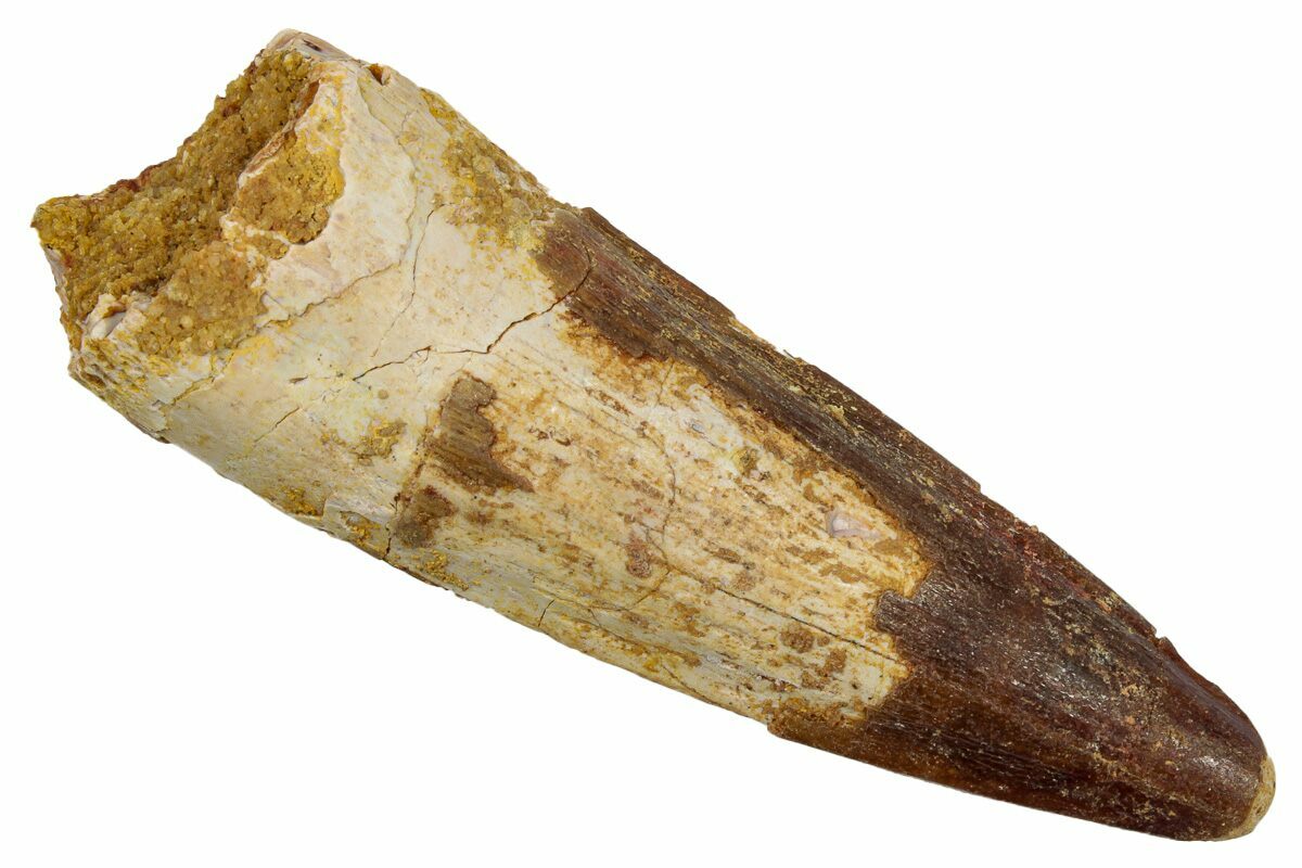 Spinosaurus teeth are relatively common fossils, but large (3+ inches), well-preserved examples are rare. These large Spinosaurus teeth will often be heavily doctored. We’ve seen many examples where multiple partial teeth can been glued to together to create a larger fake tooth, or where enamel has been painted on. One giveaway to look for is a ring of sand around the middle of the tooth, usually glued on to hide a break. Sometimes this is a sign that multiple partial teeth have been composited, but other times it is used to disguise a badly done repair job.
