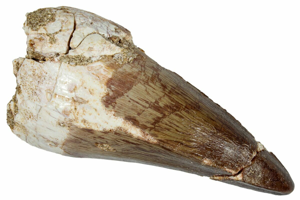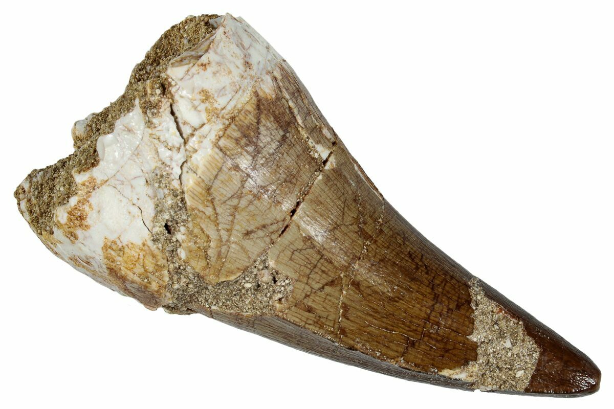 This is a 2.13" fossil mosasaur (Prognathodon sp.) tooth from the Upper Cretaceous phosphate deposits in the Oulad Abdoun Basin of Morocco.