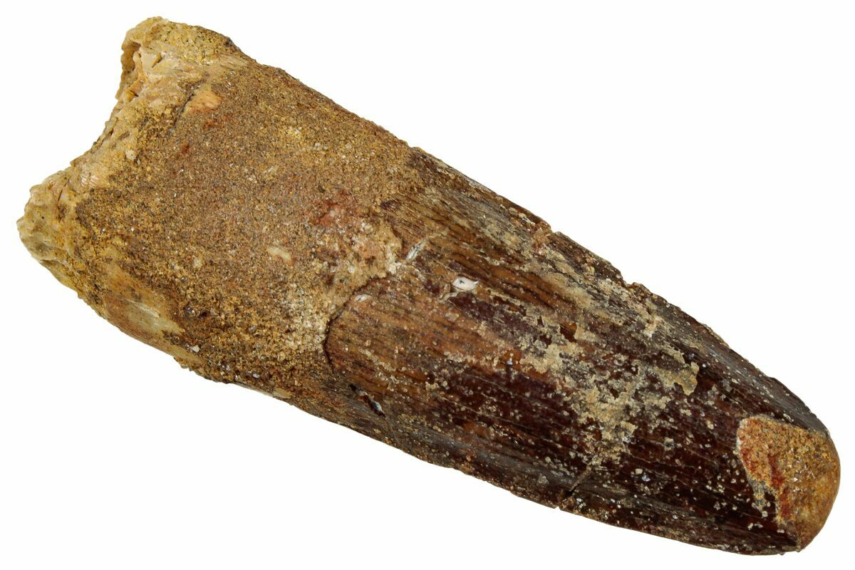 This is a 2.14" long Spinosaurus tooth from the Kem Kem Beds of Morocco. It is Late Cretaceous in age, approximately 95 million years old.