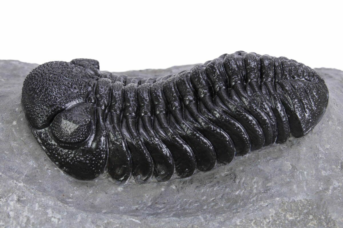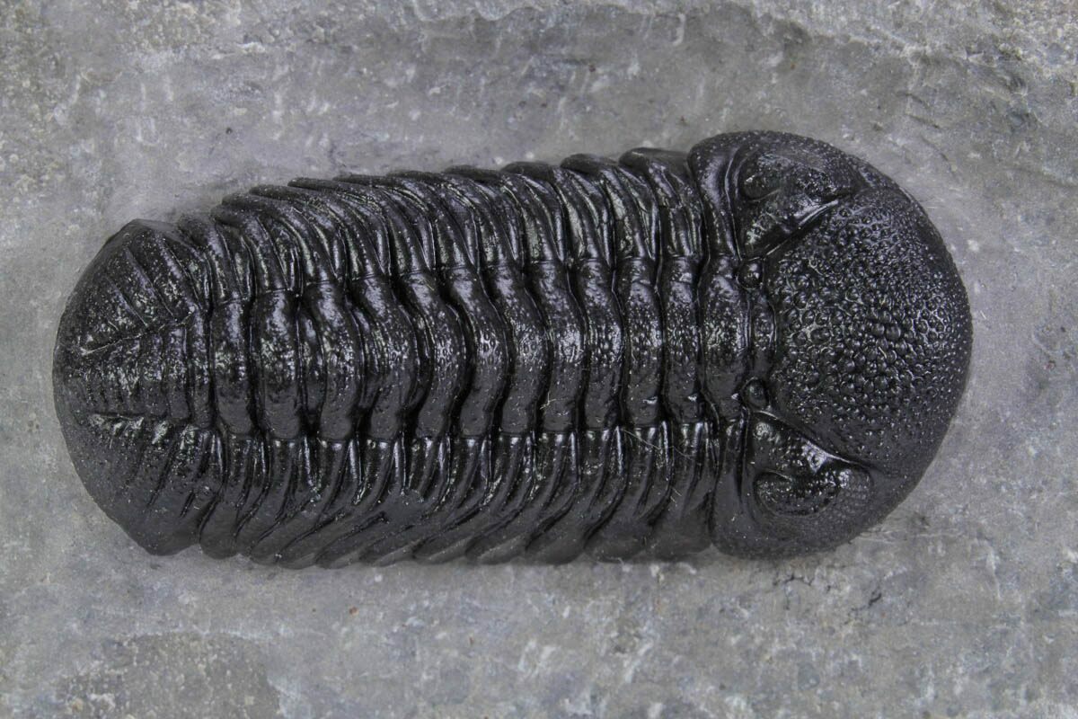 This is a beautiful, 2.15" long, prone Morocops trilobite from Ofaten, Morocco. There is excellent eye facet preservation in both eyes. It has less than 1% shell restoration along a repaired crack.