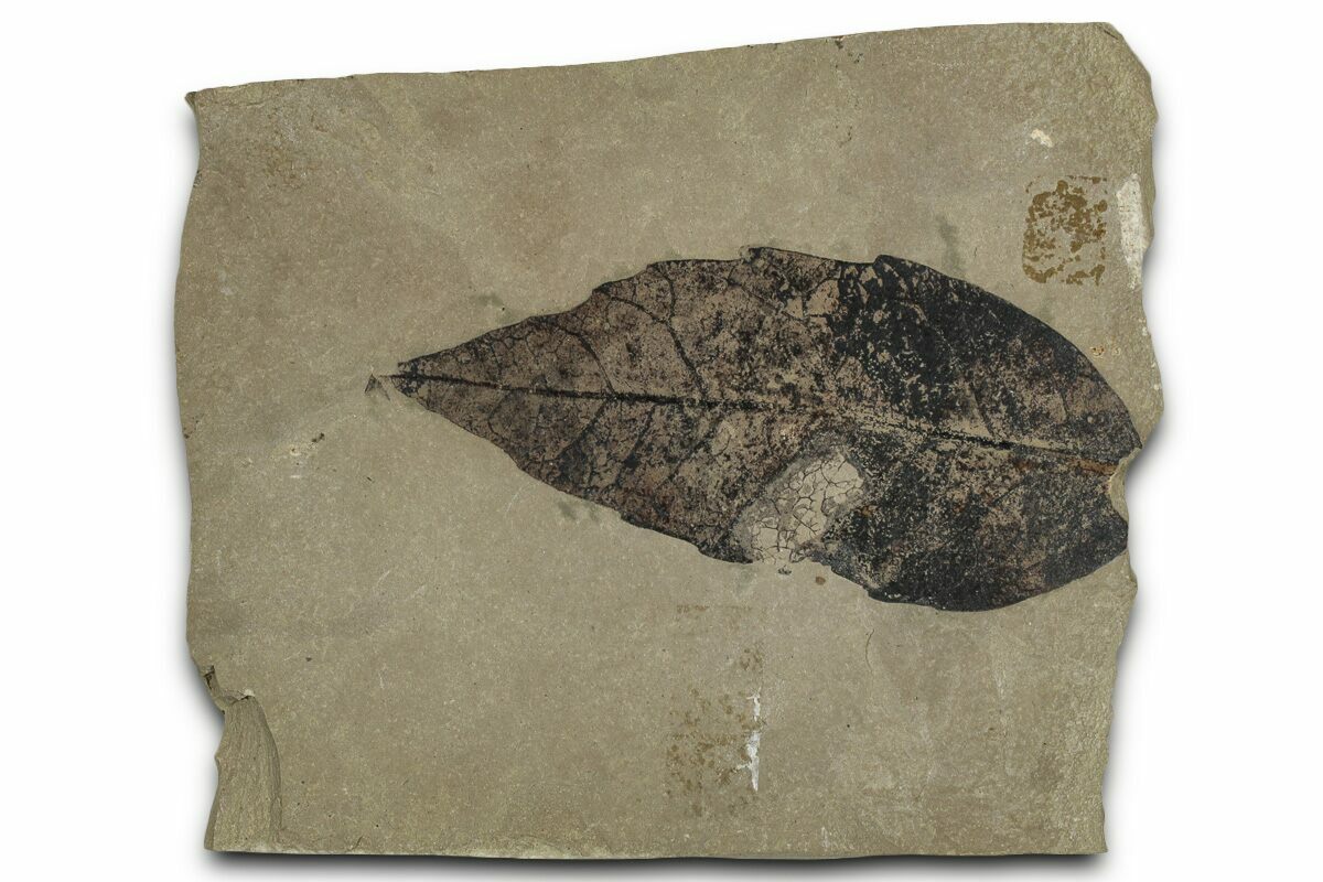 This is an Eocene aged fossil leaf of Quercus petros, a species of oak. The leaf is 2.15" long and on a piece of shale. It is nicely preserved with crisp edges and a dark brown color that contrasts nicely against the rock. Fine details are faint, but can be seen and there are signs of insect predation.