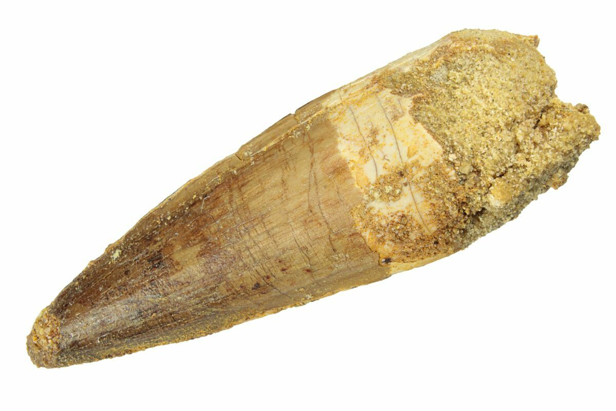 Spinosaurus teeth are relatively common fossils, but large (3+ inches), well-preserved examples are rare. These large Spinosaurus teeth will often be heavily doctored. We’ve seen many examples where multiple partial teeth can been glued to together to create a larger fake tooth, or where enamel has been painted on. One giveaway to look for is a ring of sand around the middle of the tooth, usually glued on to hide a break. Sometimes this is a sign that multiple partial teeth have been composited, but other times it is used to disguise a badly done repair job.