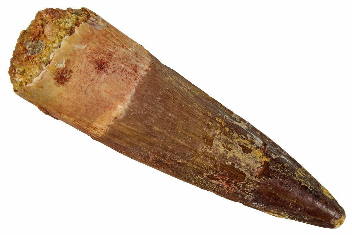 This is a 2.15" long Spinosaurus tooth from the Kem Kem Beds of Morocco. It is Late Cretaceous in age, approximately 95 million years old.