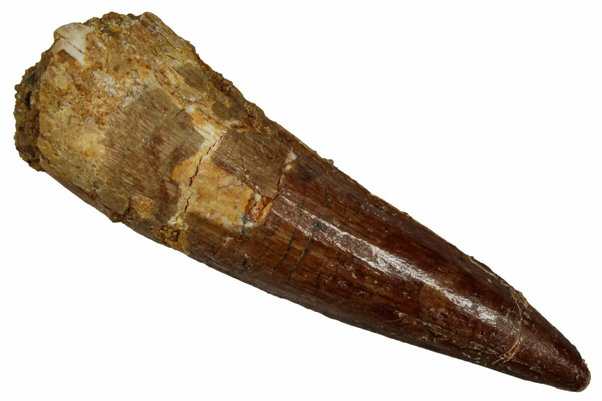 This is a 2.15" long Spinosaurus tooth from the Kem Kem Beds of Morocco. It is Late Cretaceous in age, approximately 95 million years old.