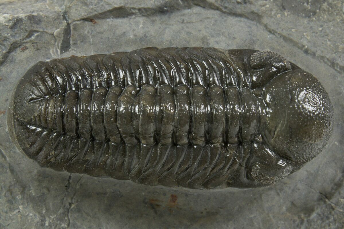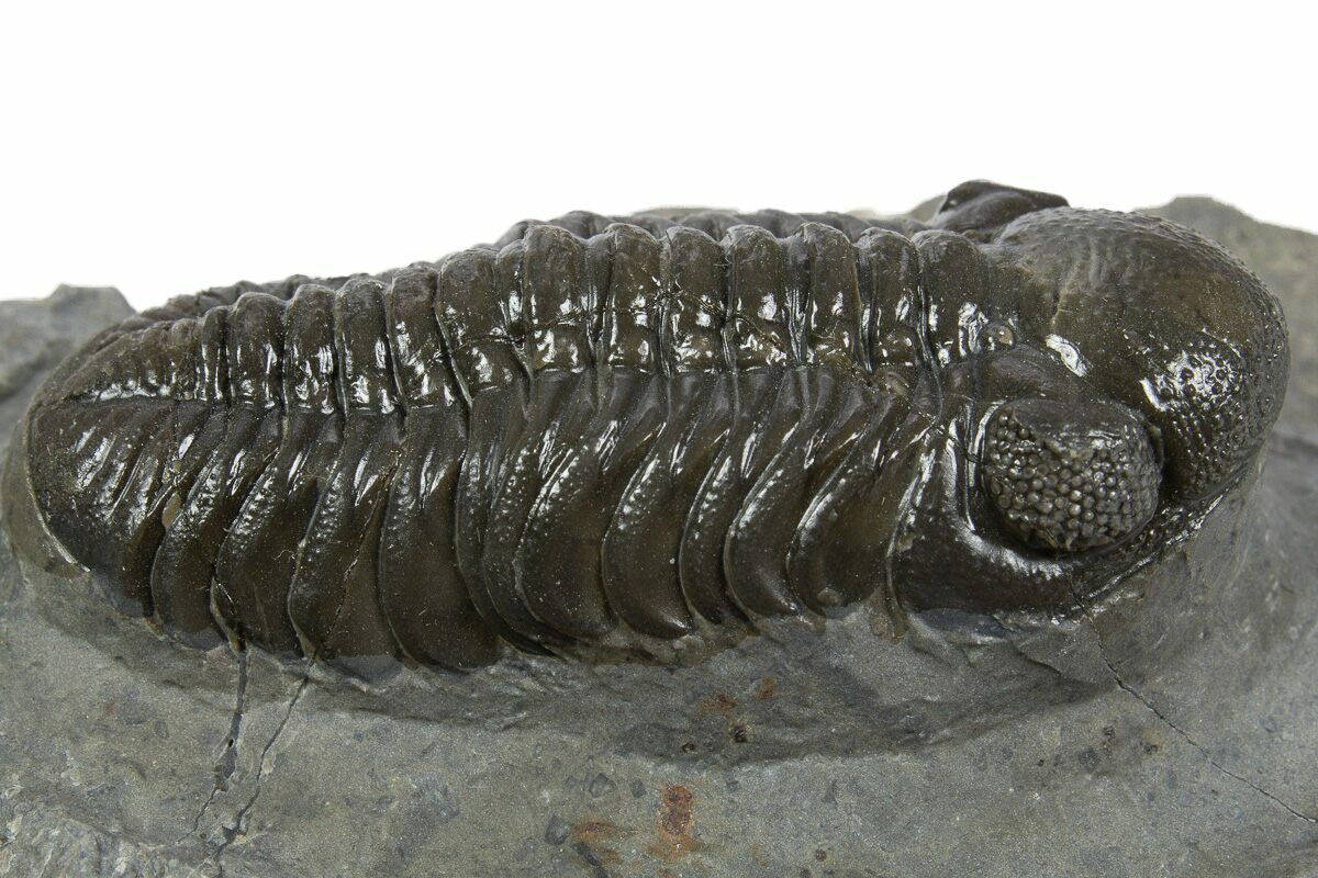 This is a beautifully preserved, 2.15" long Austerops trilobite from Ofaten, Morocco. It is laid out mostly prone with beautiful eye facet preservation. It has about 2-3% shell restoration along repaired cracks.