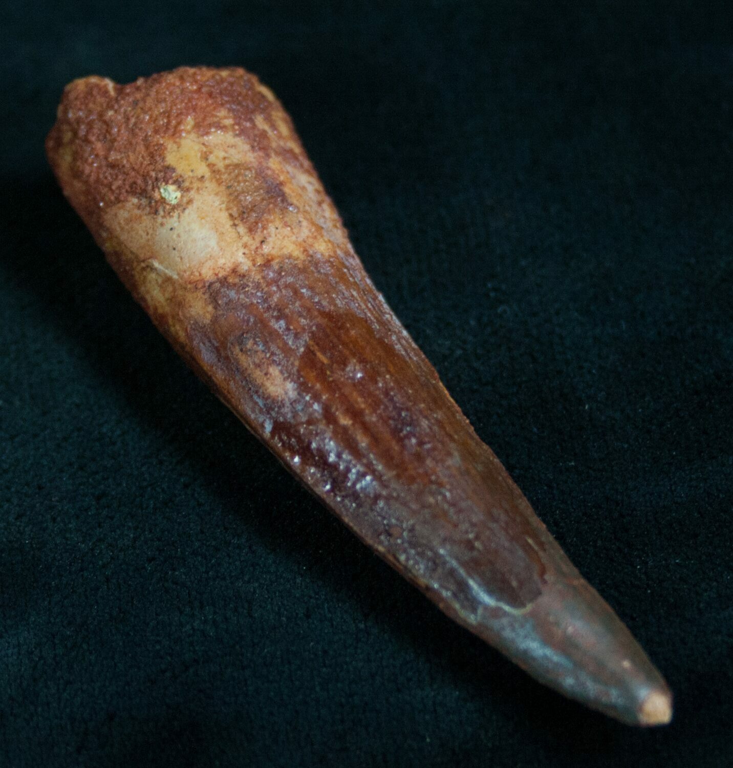 This is a 2.15" long tooth a Spinosaurus the largest known meat eating dinosaur. It's Late Cretaceous, approximately 100 million years old and from the Kem Kem Basin in Morocco. This tooth has nice enamel preservation, a little bit of the root present and no restoration or repair.
