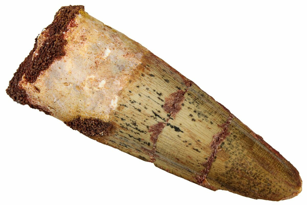 This is a 2.16" long Spinosaurus tooth from the Kem Kem Beds of Morocco. It is Late Cretaceous in age, approximately 95 million years old.