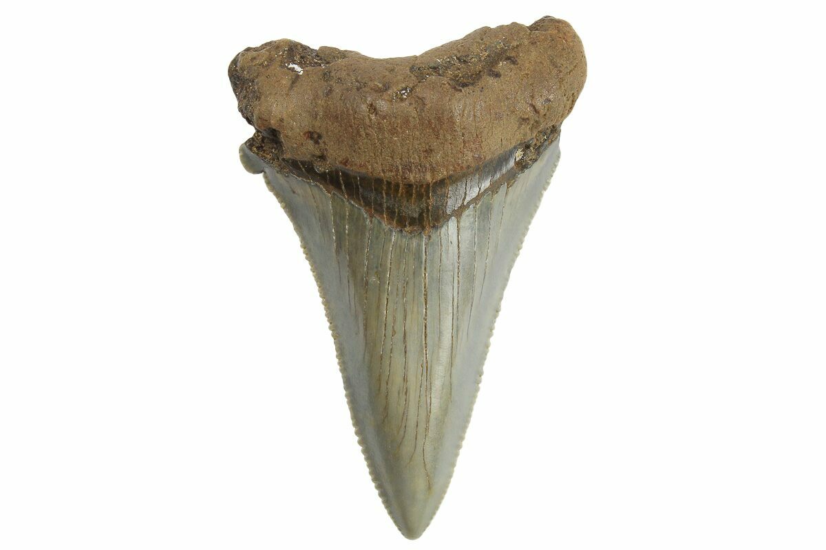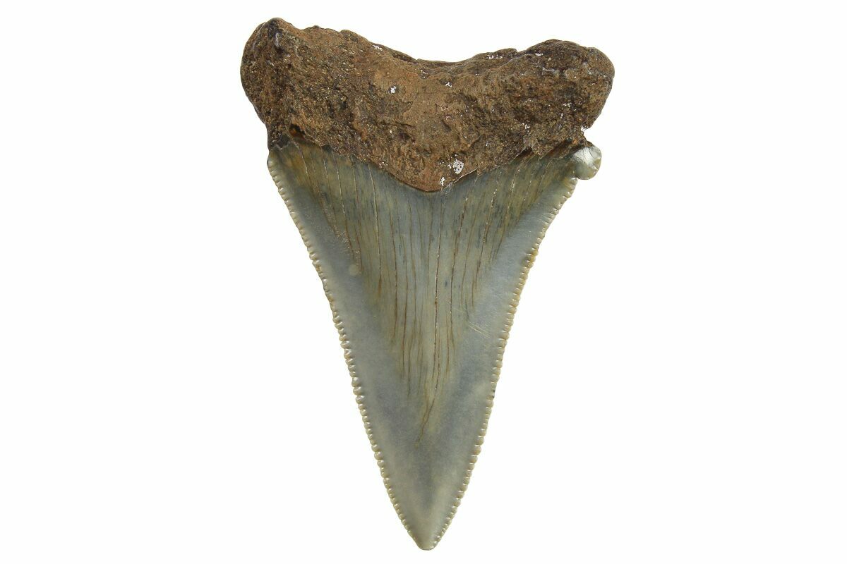 This is a serrated, 2.16" long fossil Otodus angustidens shark tooth. Angustidens is believed to be an ancestor of the fearsome megalodon shark, though it did not grow nearly as large.