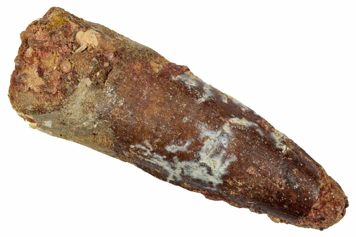 This is a 2.18" long Spinosaurus tooth from the Kem Kem Beds of Morocco. It is Late Cretaceous in age, approximately 95 million years old.