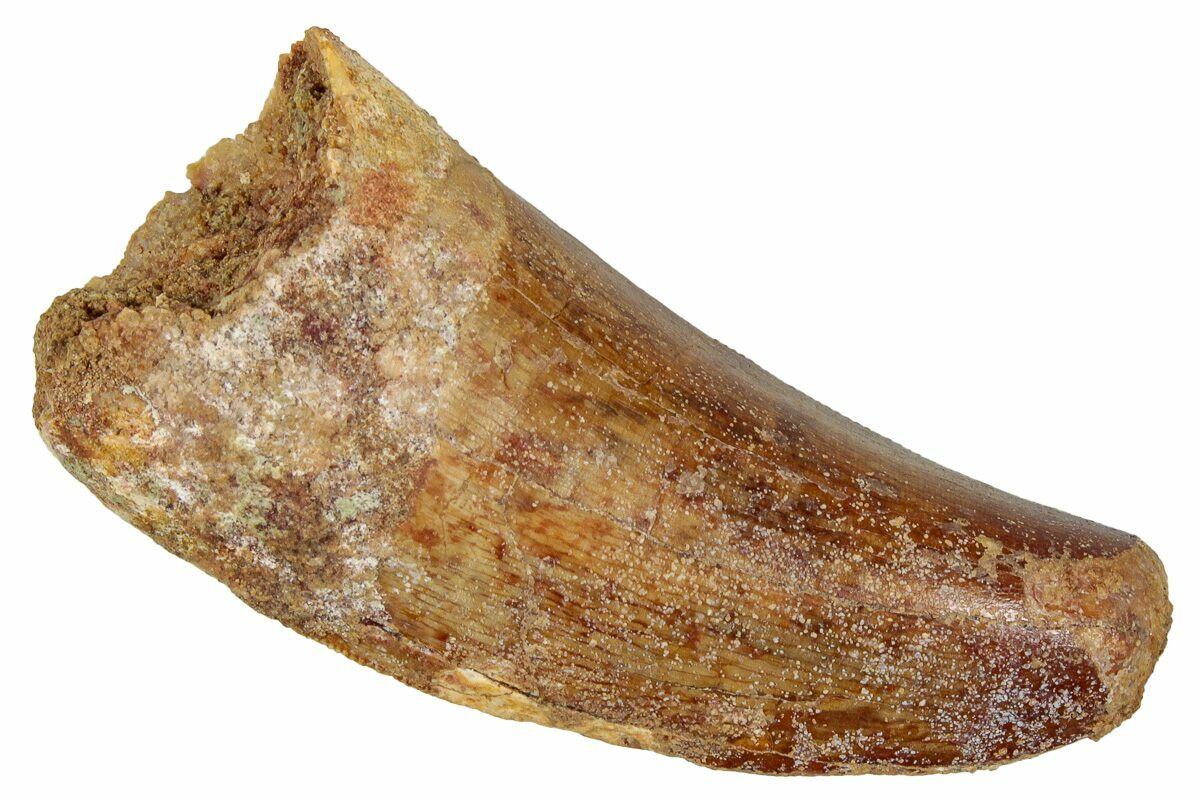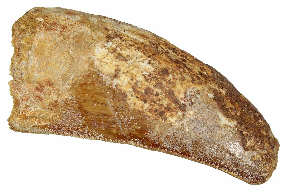 This is a good-sized, serrated, 2.18" long tooth of a Carcharodontosaurus from the Late Cretaceous Kem Kem Beds of Morocco. Carcharodontosaurus was a massive predatory dinosaur larger than Tyrannosaurus rex.