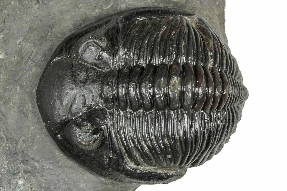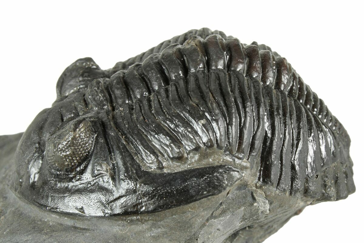 This is a detailed, 2.2" long Hollardops trilobite fossil quarried near Ofaten, Morocco. It has nice eye facet preservation in both eyes. It has about 2% shell restoration, all on its tail and comes with an acrylic display stand.