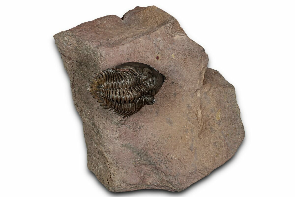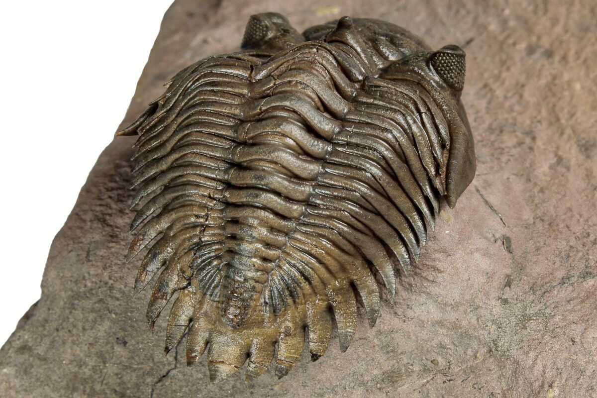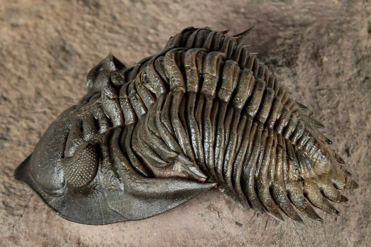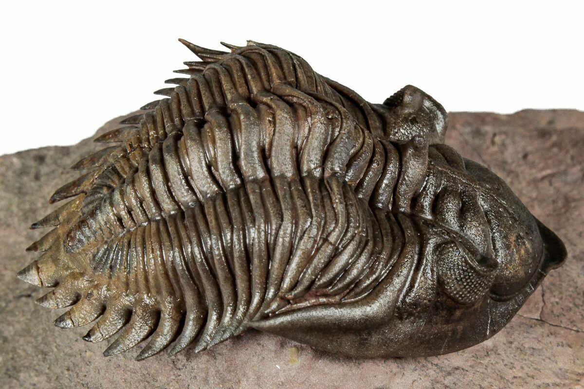 This is a stunning, 2.2" long specimen of Metacanthina issoumourensis often referred to as an "Asteropyge" or “Kayserops”. It was quarried near Lghaft, Morocco, and has nice eye facet preservation in both eyes. Nearly all of the rock has been removed from around it, leaving it flying on a pedestal of stone. A really aesthetic preparation.