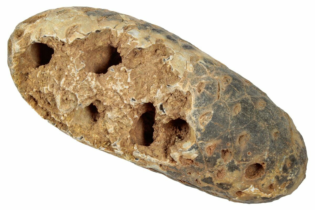 These seed cones found in the Western Sahara of Morocco have are a bit of a mystery and have not yet been described. They are often labeled is "pine cones" and there has also been speculation that they might be aggregate fruits or horsetail seed pods. But, most likely these silica-replaced (agatized) fossils are the seed pods of Cycadophytes. These fossil cones often bear the signs of insect predation, being partially eaten.