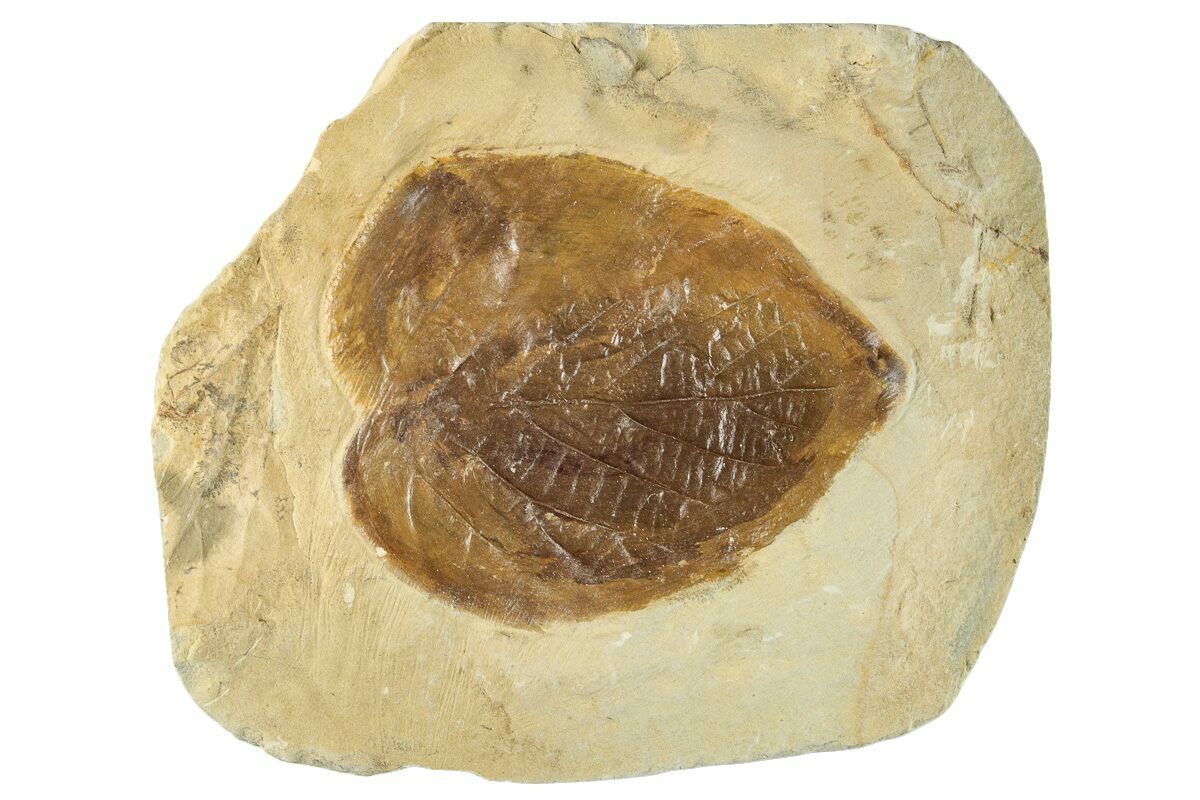 This is a 2.2" long fossil leaf (Craspedodromophyllum malmgrenii) from the Fort Union Formation near Glendive, Montana. The dark orange/brown preservation contrasts well against the shale, and many of the details in the leaf can be seen in good relief.