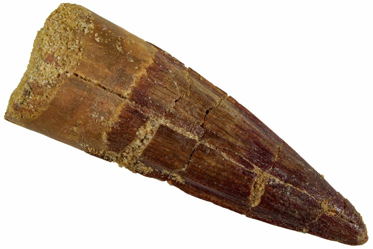 Spinosaurus teeth are relatively common fossils, but large (3+ inches), well-preserved examples are rare. These large Spinosaurus teeth will often be heavily doctored. We’ve seen many examples where multiple partial teeth can been glued to together to create a larger fake tooth, or where enamel has been painted on. One giveaway to look for is a ring of sand around the middle of the tooth, usually glued on to hide a break. Sometimes this is a sign that multiple partial teeth have been composited, but other times it is used to disguise a badly done repair job.