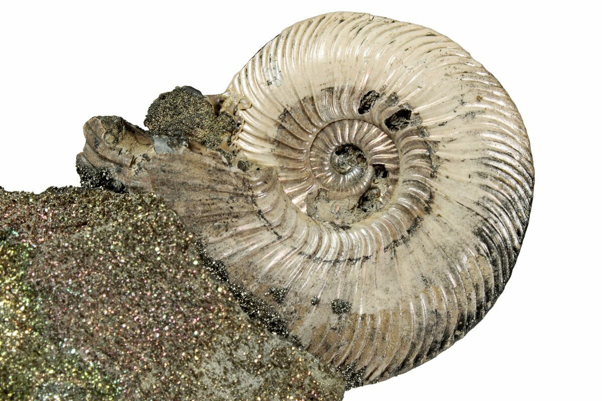 This is an interesting and colorful pyritized ammonite (Quenstedticeras sp.) display. The ammonite was collected from the Middle Jurassic age deposits along the banks of the Volga River near Saratov, Russia. It has been mounted to this section of iridescent pyrite ("rainbow pyrite") encrusted rock to create this alluring display.